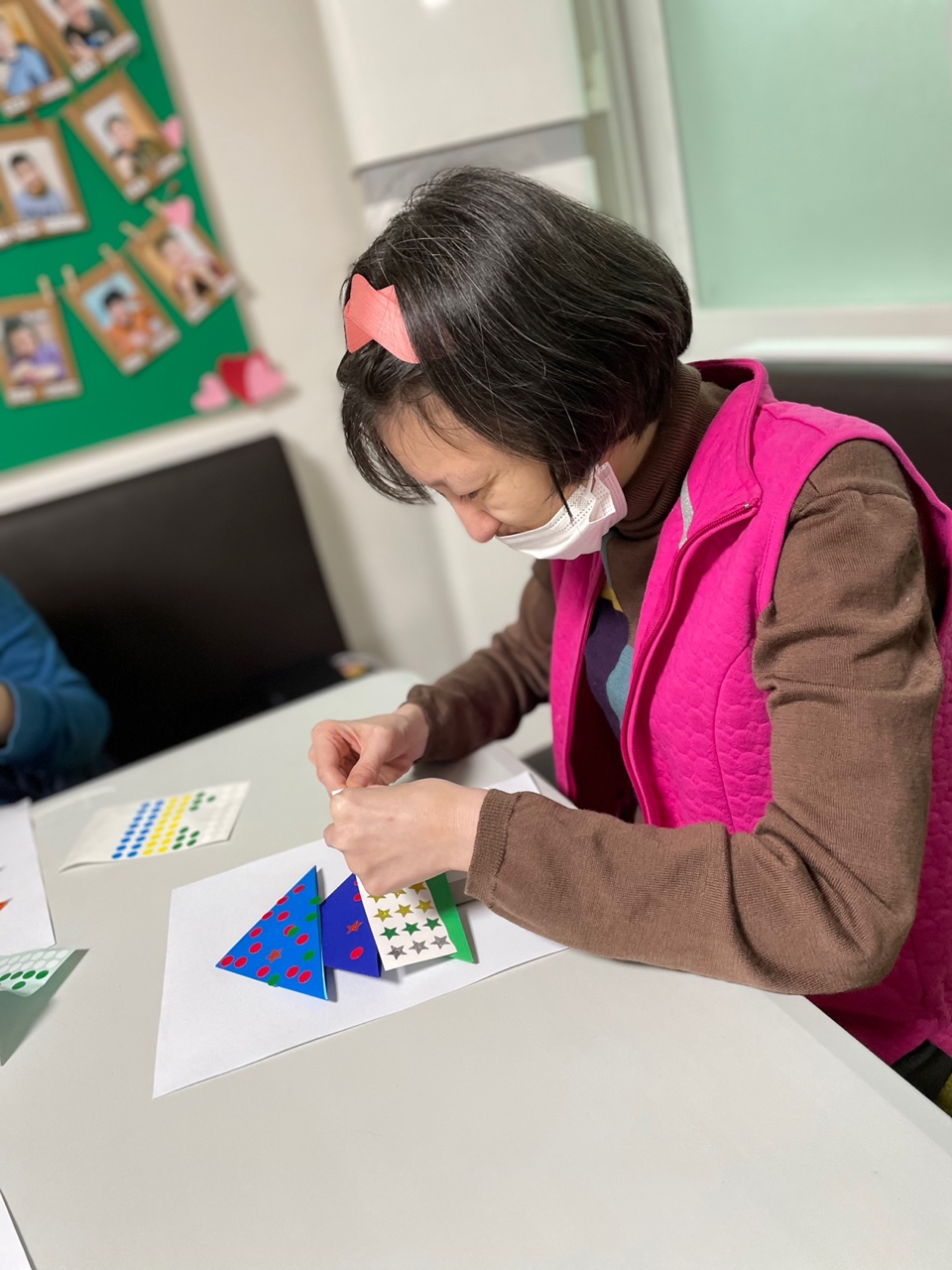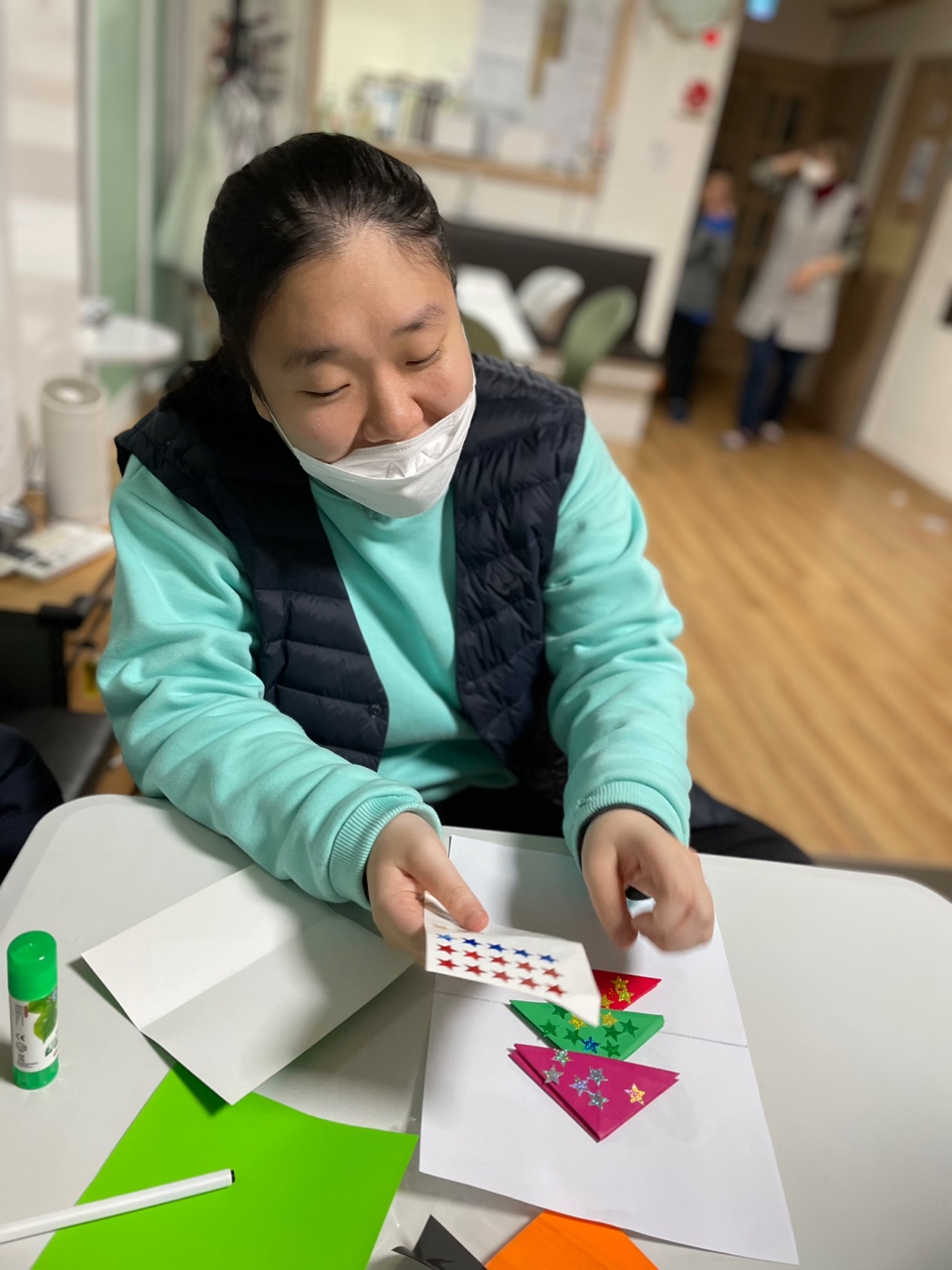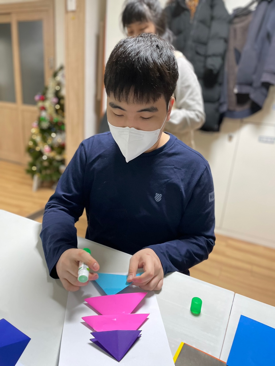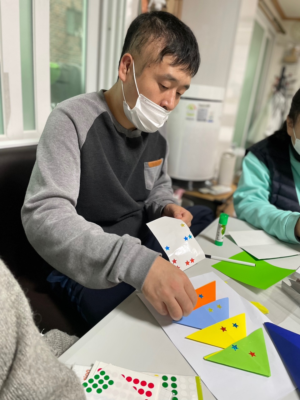 대형 크리스마스트리꾸미기 활동의 연계로 이용자분들과 소근육활동으로 색종이를 접어 트리를 만들고 알록달록스티커로 꾸며 보았습니다.