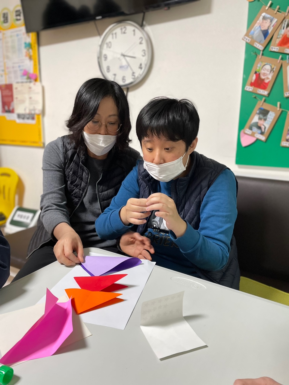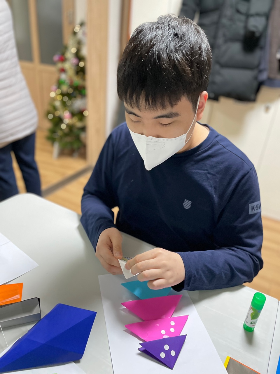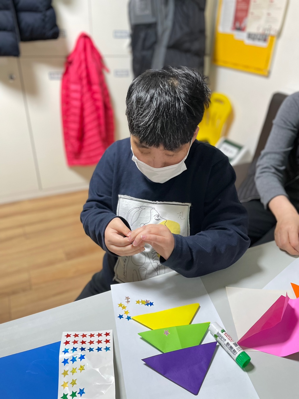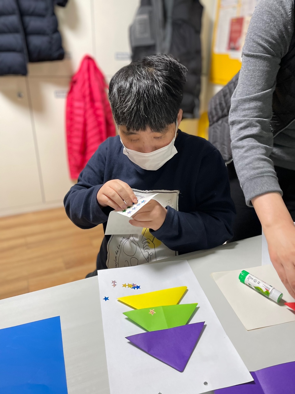 대형 크리스마스트리꾸미기 활동의 연계로 이용자분들과 소근육활동으로 색종이를 접어 트리를 만들고 알록달록스티커로 꾸며 보았습니다.