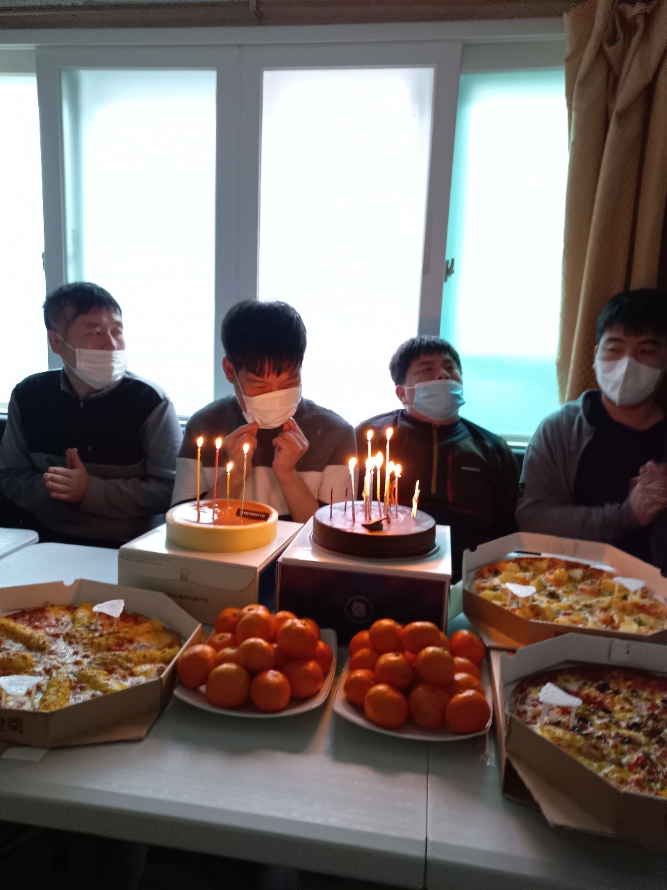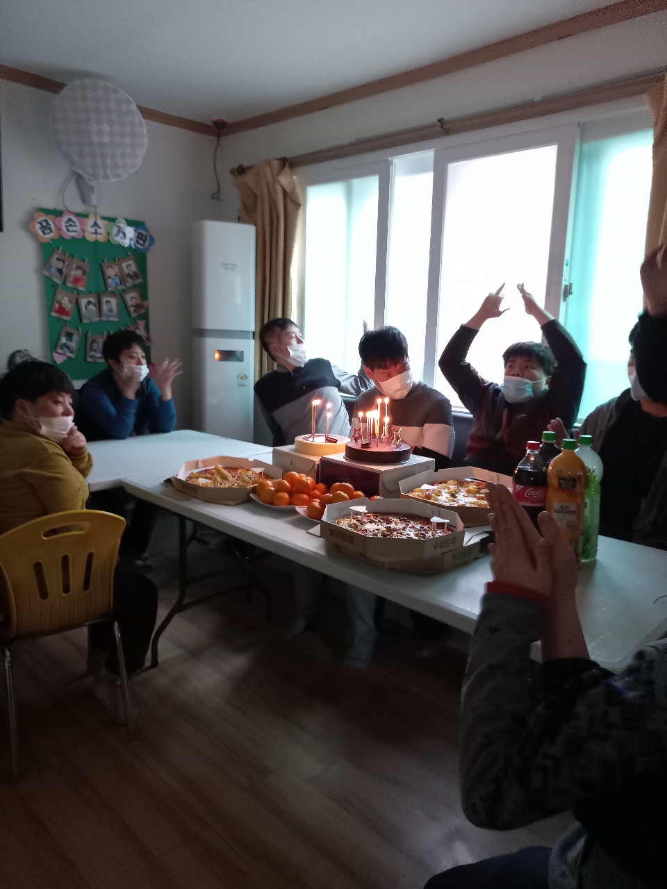 모두 축하하며 케이크와 피자, 귤, 음료수를 맛있게 나누어 먹었고