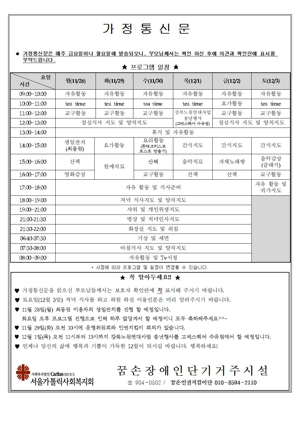 2022년 11월 넷째주 가정통신문입니다.