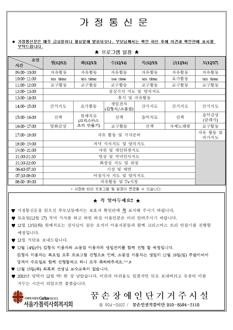 2022년 12월 셋째주 가정통신문입니다.